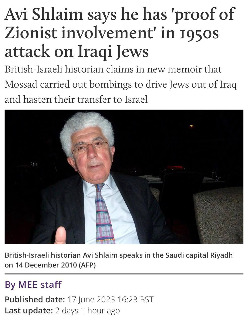 Böyük Britaniyalı-İsrailli tanınmış tarixçi Avi Şlaym, 1950-ci illərdə İraqlı yəhudilərə qarşı edilən hücumlarla bağlı “Sionistlərin iştirakına dair sübutları” olduğunu iddia edir. O, xatirələrində yazır ki, Mossad Bağdadda partlayış təşkil edərək, İraqdakı yəhudilərin İsrailə köçünü sürətləndirməyə çalışıb.